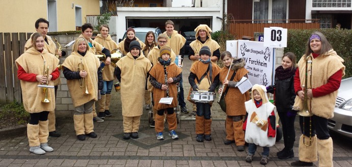 Bei herrlichem Sonnenschein zogen am Fasenachtsdienstag 19 (Jung) Musiker als Schafherde verkleidet und mit “handgemachter” Musik durch Forchheims Straßen,